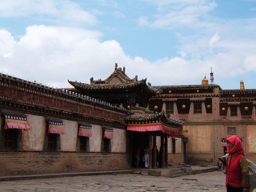 沿途是绿色的,班车上多数是当地人,黑黑的脸上有着两片高原红,乌黑的头发,清亮略显羞涩的眼神,好奇的看看我们然后就转过头去。一下子让人就喜欢上他们。藏民戴的珠子和银子让人惊羡,只有他们才可以把那些东西戴得那么好看。一进塔尔寺看见在如意白塔前面举办的一个什么活动,参加者多为外国人。年轻的红色喇嘛们围在一旁看着,用法语和藏语写的横幅让我着急。