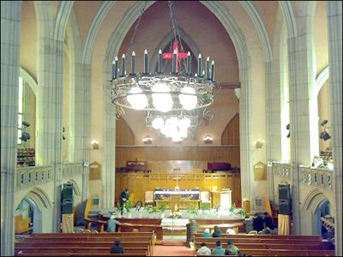 旅游辞典上这样写到:沐恩堂位于西藏中路九江路口,面对人民广场,属基督教美国卫理斯教派,又名“慕乐堂”。该建筑外观是美国学院复兴哥特式,砖木结构。大堂西南角有塔楼地座,塔楼顶部安装着五米高的霓虹灯十字架。夜光下分外夺目,成为人民广场的一大景观。