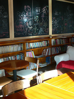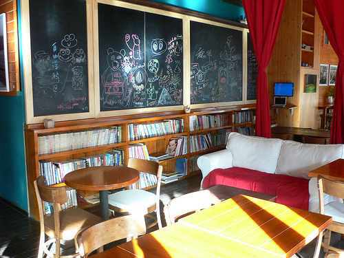 喝的话像卡布奇诺咖啡、伯爵奶茶,吃的推荐芝士蛋糕、Pizza。要说好玩的:有很多书和杂志看,可以黑板涂鸦,可以发呆。